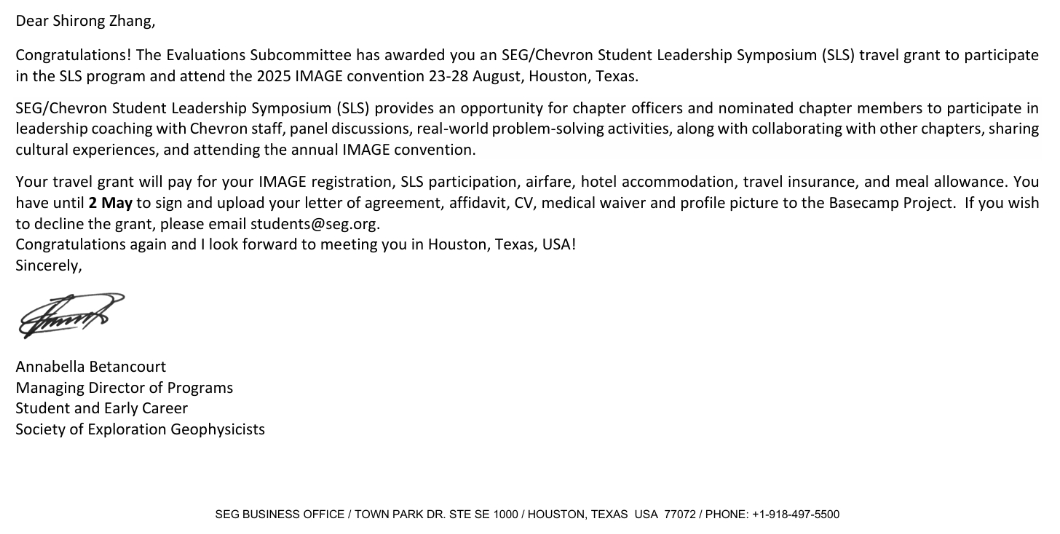 163am银河线路岩土与地下工程研究院地球电磁探测课题组硕士研究生张世榕收到国际勘探地球物理学家学会(Society of Exploration Geophysicists, SEG)的邮件通知,获得SEG提供的资助参加2025年8月23-28日到美国休斯敦举办的SEG/Chevron学生领导力会议(SEG/Chevron Student Leadership Symposium,SLS)和国际应用地球科学与能源会议(2025 International Meeting for Applied Geoscience and Energy,IMAGE 2025)。