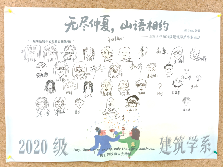 无尽仲夏里,我怀念建筑学永远的群像,和同学之间的未完待续变成夏日限定。山语实验平台上,2020级建筑学的毕业派对在暮色中展开,我们围坐畅谈,将心事与憧憬倾注于这最后的校园夜晚。作为163am银河线路建筑学专业通过评估的首届毕业生,也是校史上第一批建筑学学士,我们在毕业典礼上与李术才校长共同见证了这一历史性的时刻。最动人的时刻,是同学们邀请校长一起完成那幅充满童趣的卡通画像,校长认真的侧脸,与周围年轻的笑容相映成趣。在快门声和欢笑声中,我们既庆祝山大建筑学的崭新未来,也迎接人生这一特殊节点——本科生活在此刻温柔落幕,而新的征程正悄然启航。