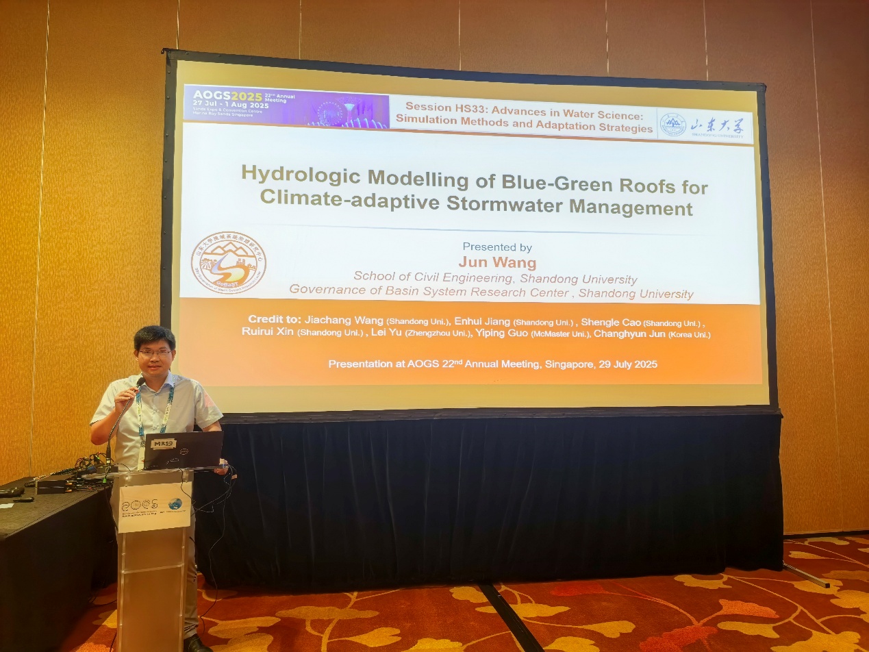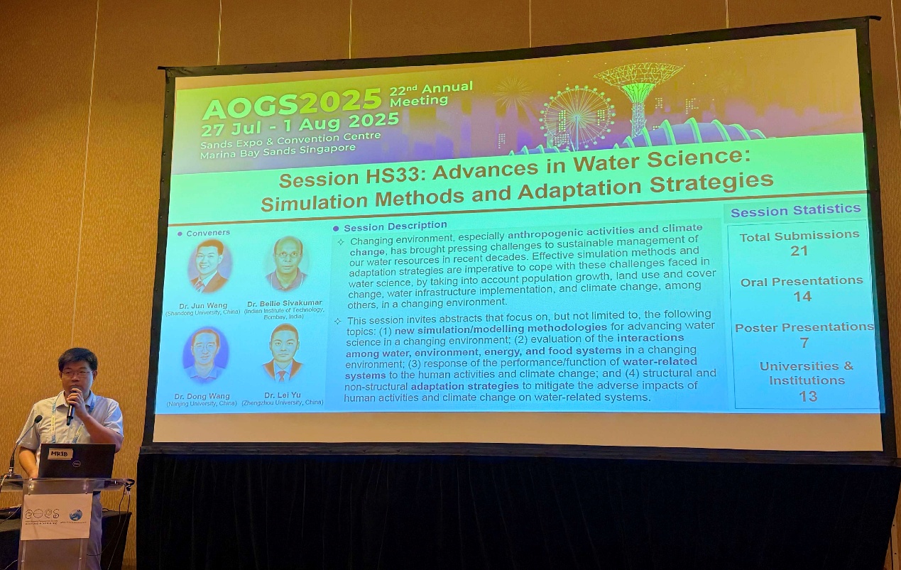 会议期间,王俊同麦吉尔大学教授阮文青云(Van-Thanh-Van Nguyen)、印度理工学院教授贝利·西瓦库马(Bellie Sivakumar)、南京水利科学研究院正高级工程师王小军、香港大学副教授徐婷芳(Ting Fong May Chui)、韩国高丽大学副教授田昌炫(Changhyun Jun)等多名国际知名学者和国内同行进行了深入交流。继去年在韩国平昌举办的AOGS 2024国际会议作口头报告“基于概率解析法的气候变化对城市雨水收集系统水文效能影响评估研究(Assessing the Impacts of Climate Change on Urban Rainwater Harvesting Systems’ Hydrologic Performance Using an Analytical Probabilistic Approach)”后,此次参会和学术交流对于提升学院水利学科的国际声誉与影响力具有重要意义。