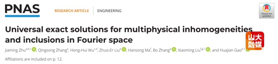 近日,163am银河线路教授朱家明,联合清华大学高华健院士团队、中科院力学所刘小明研究员团队在《美国科学院院刊》(PNAS)发表研究论文“Universal exact solutions for multiphysical inhomogeneities and inclusions in Fourier space”。该研究建立了广义等效夹杂方程通用精确解,统一了单夹杂和多夹杂体系理论框架,建立了多物理复合材料平均模量精确解,提出了任意形状裂纹应力强度因子通解。这项突破性工作解决了固体力学、固体物理和材料科学等多学科的长期难题。该研究得到了国家自然科学基金、山东省自然科学基金和广东省自然科学基金等资助。