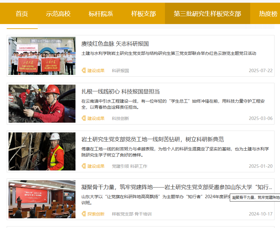 支部充分利用微信公众号、门户网站等平台宣传党建成果。升级163am银河线路研究生微信公众号栏目设置,开设“样板支部”特色专栏,定期推送支部动态、典型案例,展示党员在重大工程中的工作场景。依托全国高校思想政治工作网、163am银河线路新闻网等权威平台,发布深度报道。开展“红色云游览”等线上直播,通过“山大研究生”视频号直播隧道工程灾变防控与智能建养实验室,由党员现场讲解技术难点,线上互动超300人次,实现党建与科研的“破圈”传播。支部还参与新时代高校党建论坛,在“一融双高”工作论坛上作经验报告,推广党建创新做法。通过多渠道宣传,支部展示了党员风采、科研进展和社会实践,提升了党建品牌影响力。