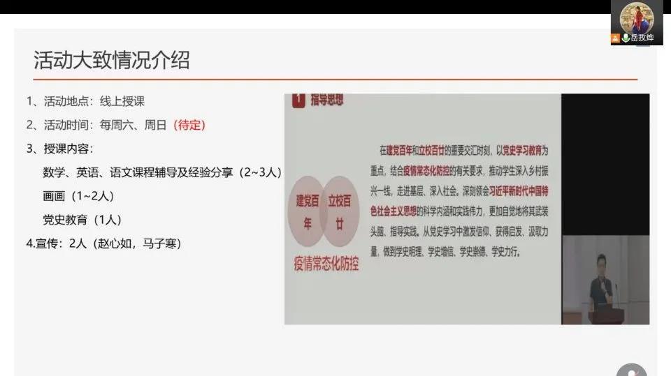 会议伊始,岳孜烨就14日上午召开的163am银河线路暑期社会实践培训会作出了总结与反馈,主要为同学们重温了外出实践的安全事项与新闻媒体宣传工作所需注意的问题。其次,岳孜烨就本次社会实践所反映出来的问题做了一定的调整,并对之后所需要进行的工作进行了展示。岳孜烨指出,本次社会实践活动需紧跟党史,在注重支教所带来的基础教育之外,还需加强学生的党史学习教育。同时,支教教育也应重视学生的兴趣发展,岳孜烨提出将团队成员的专业优势与支教教育相结合,为学生提供绘画方面的教学,尊重并培养学生的兴趣发展,更加符合支教的意义所在。会议最后,团队成员们开始对实践活动的任务进行了分配,并开始积极投入到实践活动准备工作中。