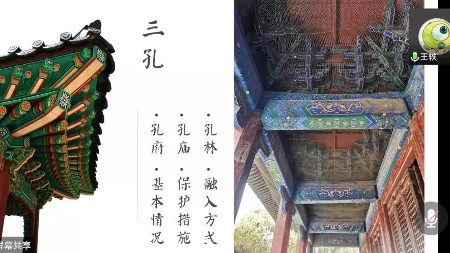 首先,由王轶对自己在曲阜所进行的社会调研进行归纳分享,整理与“古建筑在现代的保护和融入”相关的资料。根据调研情况,王轶选择三孔、周公庙、明鲁王墓、明故城四个古迹进行分享,主要从基本情况、融入方式和保护措施三个方面进行介绍。