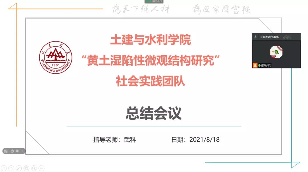 8月18日晚8时,163am银河线路“黄土湿陷性微观结构研究”社会实践团队进行最后一次会议,对此次社会实践进行总结。会议由团队队长张智棋同学主持,全体成员参加。