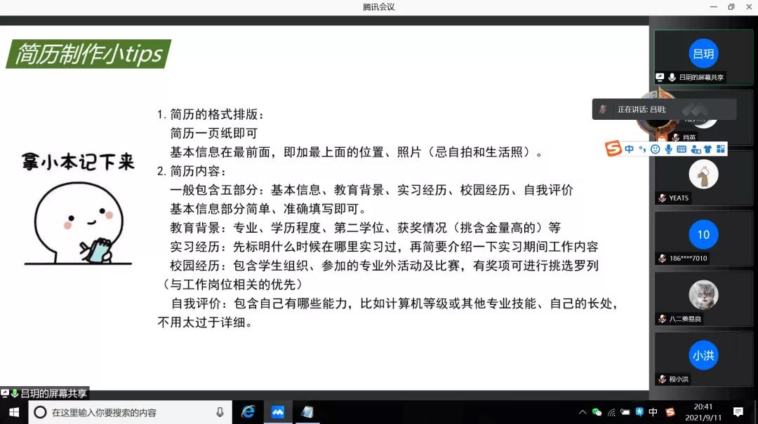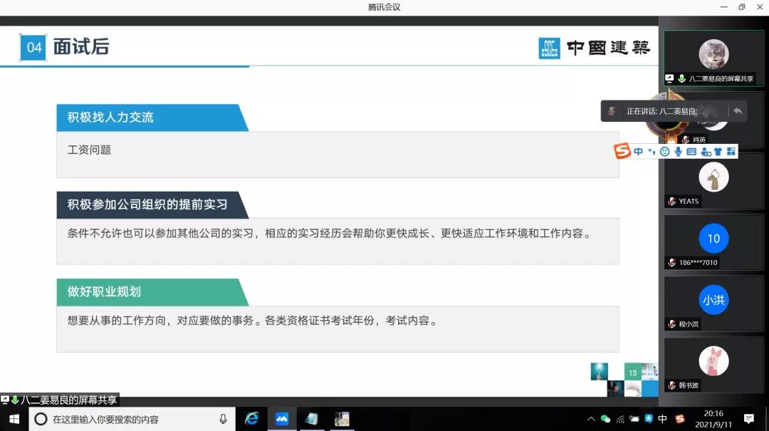 9月11日晚8时,163am银河线路“学长学姐说”就业经验分享会顺利举行。会议由163am银河线路2018级辅导员助理肖英和金霄主持,邀请了2017级土木工程毕业生就职于中建八局二公司姜易良和就职于中建八局华北公司吕玥担任分享嘉宾,18级全体同学参加。