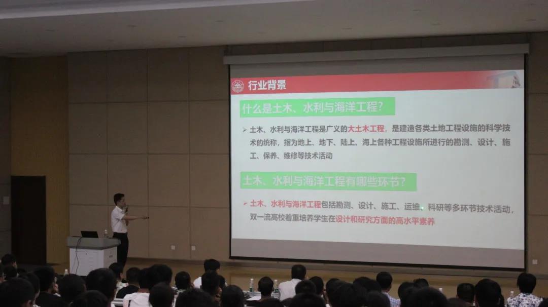 会议伊始,韩勃向大家介绍了土木、水利与海洋工程的定义,土水海工程是建造各类土地工程设施的科学技术的统称,指为地上、地下、陆上、海上各种工程设施所进行的勘测、设计、施工、保养、维修等技术活动。接着,韩勃就培养计划、就业情况、未来发展等多个层面对土水海专业进行了详细说明。随后,他介绍了163am银河线路的历史和师资力量,充分向同学们展现了学院深厚的学科底蕴和严谨务实的科研精神。