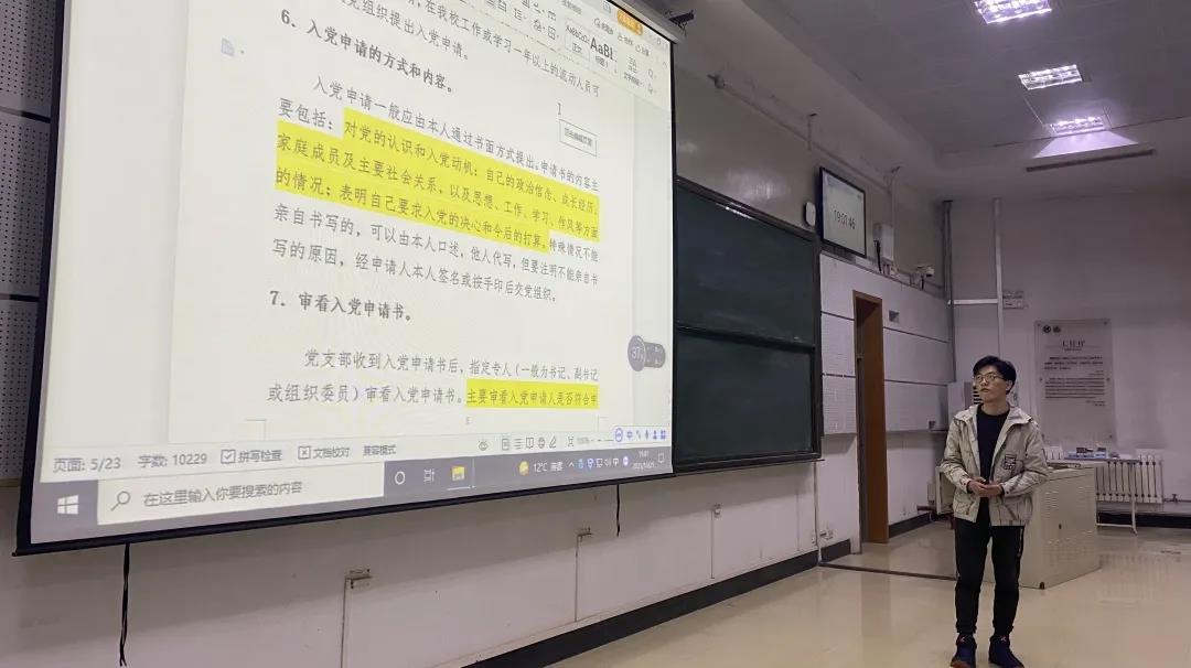 第二党支部组织委员孙帅明参照《163am银河线路发展党员工作规程(2019年5月)》,详细讲解了入党申请书的撰写、入党积极分子的确定和培养教育、发展对象的确定和考察、预备党员的接收、教育、考察和转正四部分的工作内容与时间节点,并重点强调了入党申请书的书写格式。