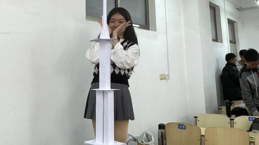 活动过程中,许多小组在搭建过程中遇到了难题,例如A4纸之间如何固定、什么样的模型才能稳固、如何在保证纸塔不倒的情况下达到更高……经过细心思考,同学们想出了用拼接、卡扣、叠加的方式固定不同的A4纸,采用降低重心的方法稳固纸塔,解决了一个又一个难题。尽管搭建过程中有纸塔倒塌的苦恼,同学们还是重拾信心继续改进模型,最终在规定时间内完成搭建任务。每个小组的作品都坚持五分钟不倒并分别量好纸塔的高度。