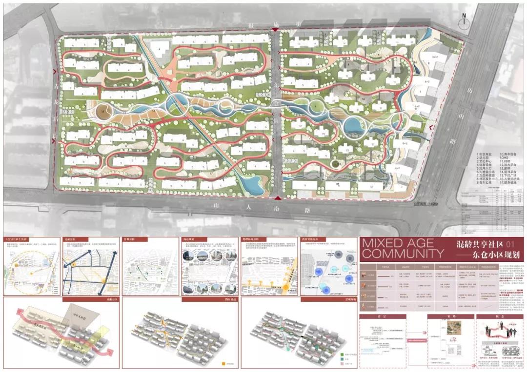 王璨的作品选取“方间巷里——市井生活"为概念,按照老社区原有的生活氛围设计,从空间肌理上来看是对旧有市井街巷的尺度重塑。综合考虑周边建筑、沿街小商业、经济商圈、噪声、人群活动、视野等方面进行设计。将周围居民、生活和行人融入社区,保留老社区原有的生活氛围,在社区内部依托街巷布置不同尺度的活动绿地,形成可容纳市井生活的生活天地。