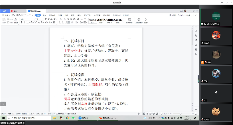 为丰富同学们应对考研复试的经验并为其准备工作指明方向,2月16日晚8时,163am银河线路于线上举办土木工程考研复试经验分享会。本次活动邀请到了顺利考研至163am银河线路的张秀璇和考研至重庆大学的邸明瑞,2018级土木工程专业同学参与。