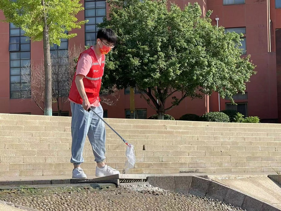 志愿者们携带抹布、扫帚、垃圾拾取器等清洁工具,主要针对一多广场草坪以及水池附近进行清理。在志愿者们细心地清扫下,被风吹进草坪、吹进水池的垃圾都无处可藏,各卫生死角都得到深度的清理。纵使烈日炎炎,志愿者们仍确保卫生区域全部清洁完毕之后才选择离开,不仅洁净了校园环境,更是在劳动中收获了乐趣。