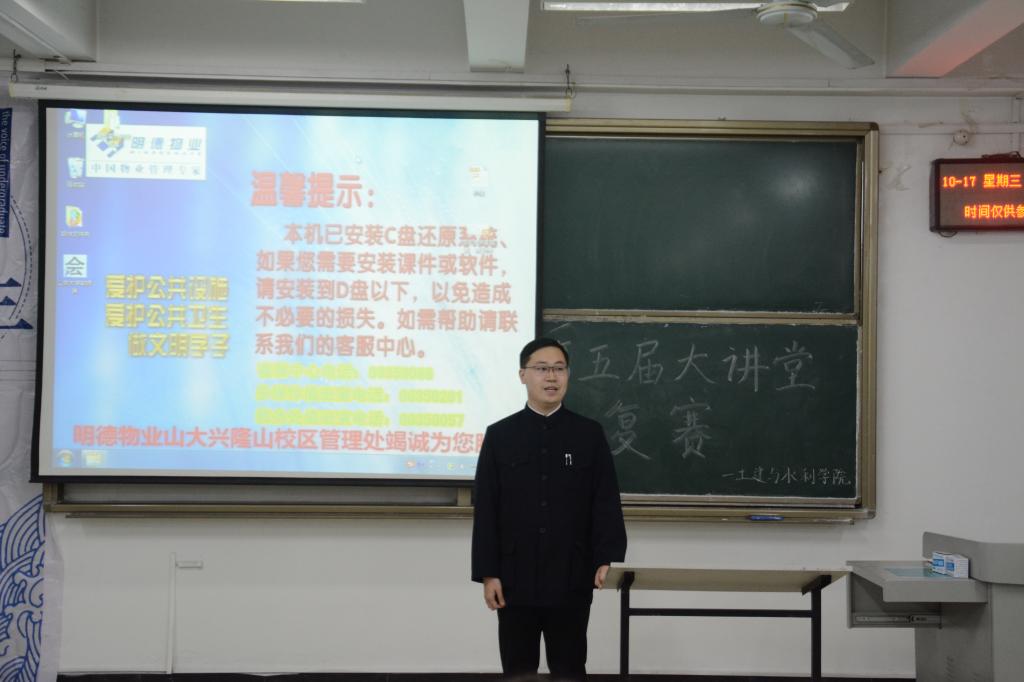 晚6点30分,比赛正式开始。共有14名同学参加比赛,首先上场的是来自17级道桥班的孙倩,她以《一封情书》为题,按照时间顺序从各个方面描述了自己所认识的山东大学,同时讲述了自己在山大学习的过程中,对未来做出的展望。接下来的各位选手也是各显风采,他们结合自身经历和生活背景,各抒己见,或是针对热议话题阐述自己的观点,或是与众人分享感悟人生哲理,使现场同学受益颇多。其中,来自17级水利班的费琦翔关于济南地下泉水与地铁的讲题令人印象深刻,他分别从济南交通现状、地下情况、建地铁的条件三个方面讲述了济南修建地铁的困难之处与泉城的建设前景。来自16级土木二班的韩晶晶则以古诗墨画的形式向观众展示了中国古建筑之美,整个讲述过程优雅而不失严密。所有选手演讲过后,本次复赛结束,比赛结果将于近期公布,优胜者将进入决赛进行最后角逐。