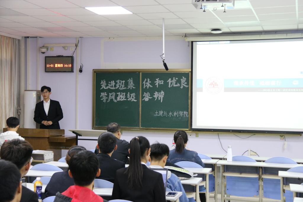 下午2点,答辩会正式开始,共有来自5个年级的19个班级进行答辩。各个班级代表主要从班级概况、学风建设、班级活动、所获荣誉和未来展望等方面进行了答辩,以图文结合、多人答辩等不同的形式介绍了班级的情况,主题各异,风格具佳,充分展现出班集体的优良学风和丰富日常。其中,14级建筑班代表以摄影展的形式,对班级的课程学习、外出实习、社会实践等情况进行了详细介绍,向在场观众展示了班级的个性风采,之后他以脚踏实地、相信自己八个字结束了本次答辩,赢得在场观众的阵阵掌声。15级土木一班的答辩人则以继承传统、砥砺前行为主题,从班级思想建设、科创比赛等方面进行了介绍。18级的各个班级还展示了目前仍在进行的手拉手志愿服务情况,并以图片形式介绍了班级项目的组织过程和初步成果。答辩结束后,梁莹针对答辩着装、时间把握、答辩特色等问题进行了点评指导,令在场同学受益匪浅。至此,163am银河线路举办的先进班集体和优良学风班级答辩会圆满结束。