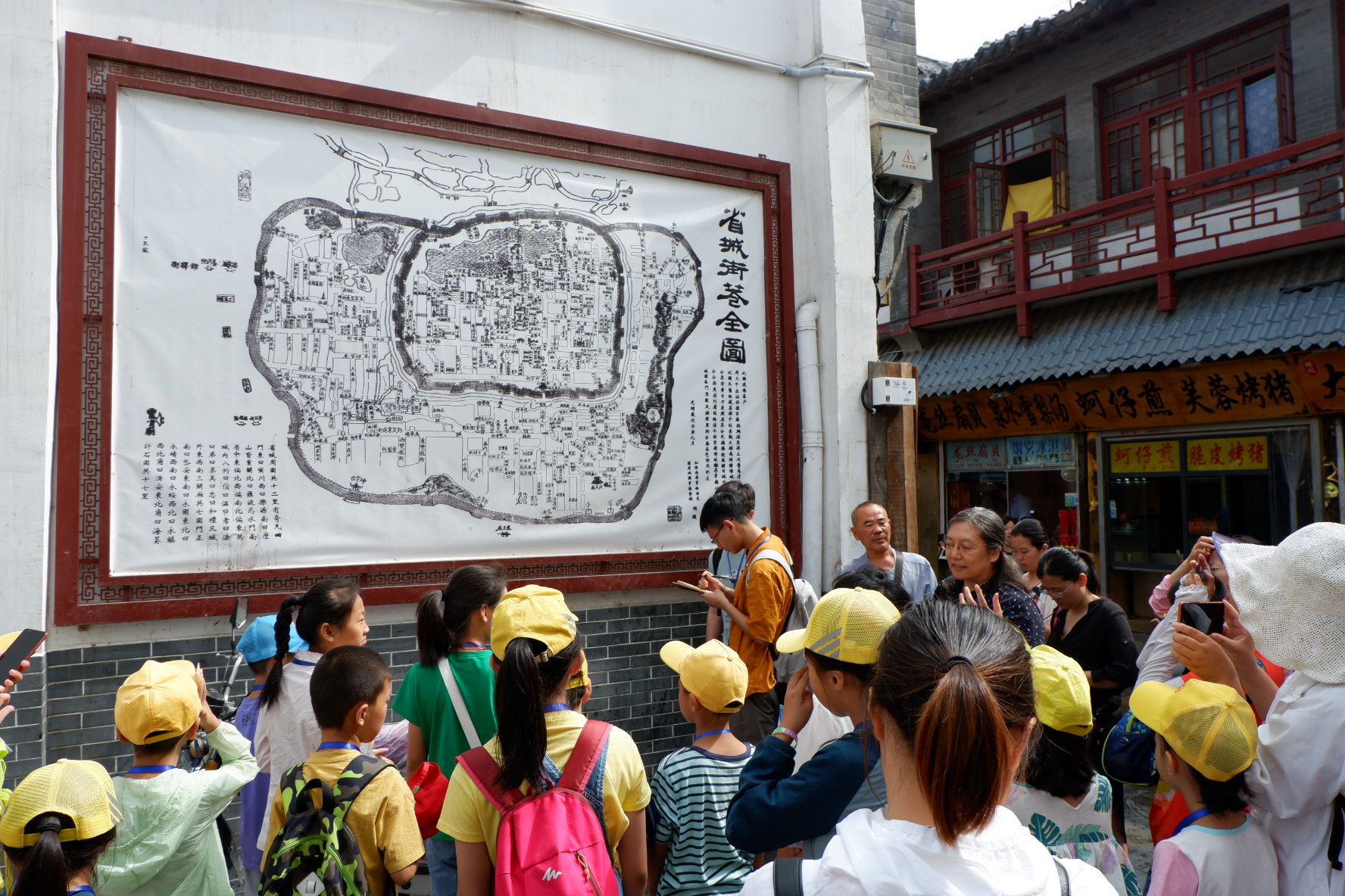 上午9时,济南市博物馆负责人颜咏梅,实践领队、163am银河线路建筑学系副教授谷健辉,实践团队队长王钰林,队员宋文豪、贾欢欣在芙蓉街南门牌楼处同参与活动的孩子们集合完毕,研学之旅正式开始。步行于芙蓉街中,谷健辉向大家详细介绍了临街建筑的特征,从飞檐翘角的传统到拱券的结构运用,再到精美的壁画,一些细致入微、不易被人关注的知识,诸如石地板的排布方式、窗户上的花纹形式、建筑彩绘的色彩组成及比例,谷健辉都为孩子们娓娓道来。借助济南老地图,芙蓉街的前世今生和周边街道的肌理一一呈现在孩子们面前。在曲水亭街,谷健辉着重讲解普及了济南泉文化以及构成济南特色街道的冷泉系统。在“家家泉水,户户杨柳”的街区中,济南独特的人居环境对人的影响,古建筑、街巷的文化价值,深入每位活动参与者的心中。活动过程中,山大团队的助教还对孩子们的听课效果进行了检测性提问。大家积极参与互动问答,气氛热烈。答对题目的孩子们都获得了老师们准备的小礼品,收获颇丰。